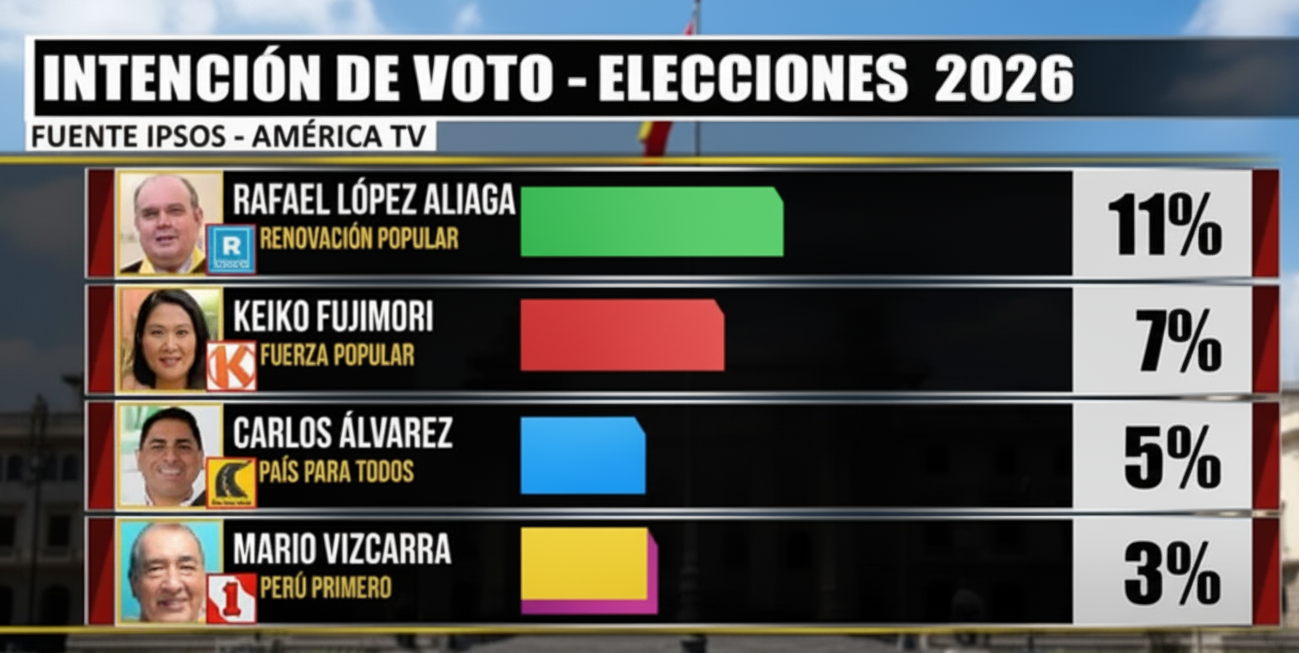 Según el reciente sondeo de Ipsos para América Televisión, Rafael López Aliaga, líder de Renovación Popular y actual alcalde de Lima, se posiciona en la cima de la intención de voto, alcanzando un 11%. Le sigue de cerca Keiko Fujimori, lideresa de Fuerza Popular, quien se ubica en el segundo lugar con un 7%.