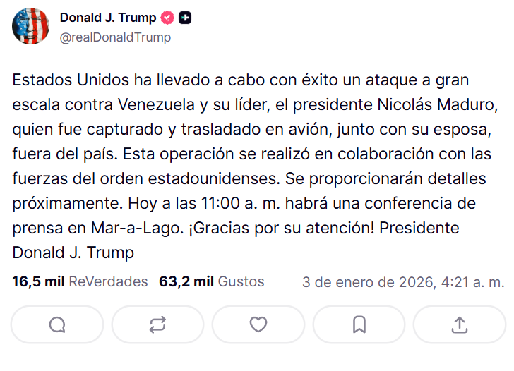 «Estados Unidos ha llevado a cabo con éxito un ataque a gran escala contra Venezuela y su líder, el presidente Nicolás Maduro, quien fue capturado y trasladado en avión, junto con su esposa, fuera del país», afirmó el presidente estadounidense en su comunicado.
